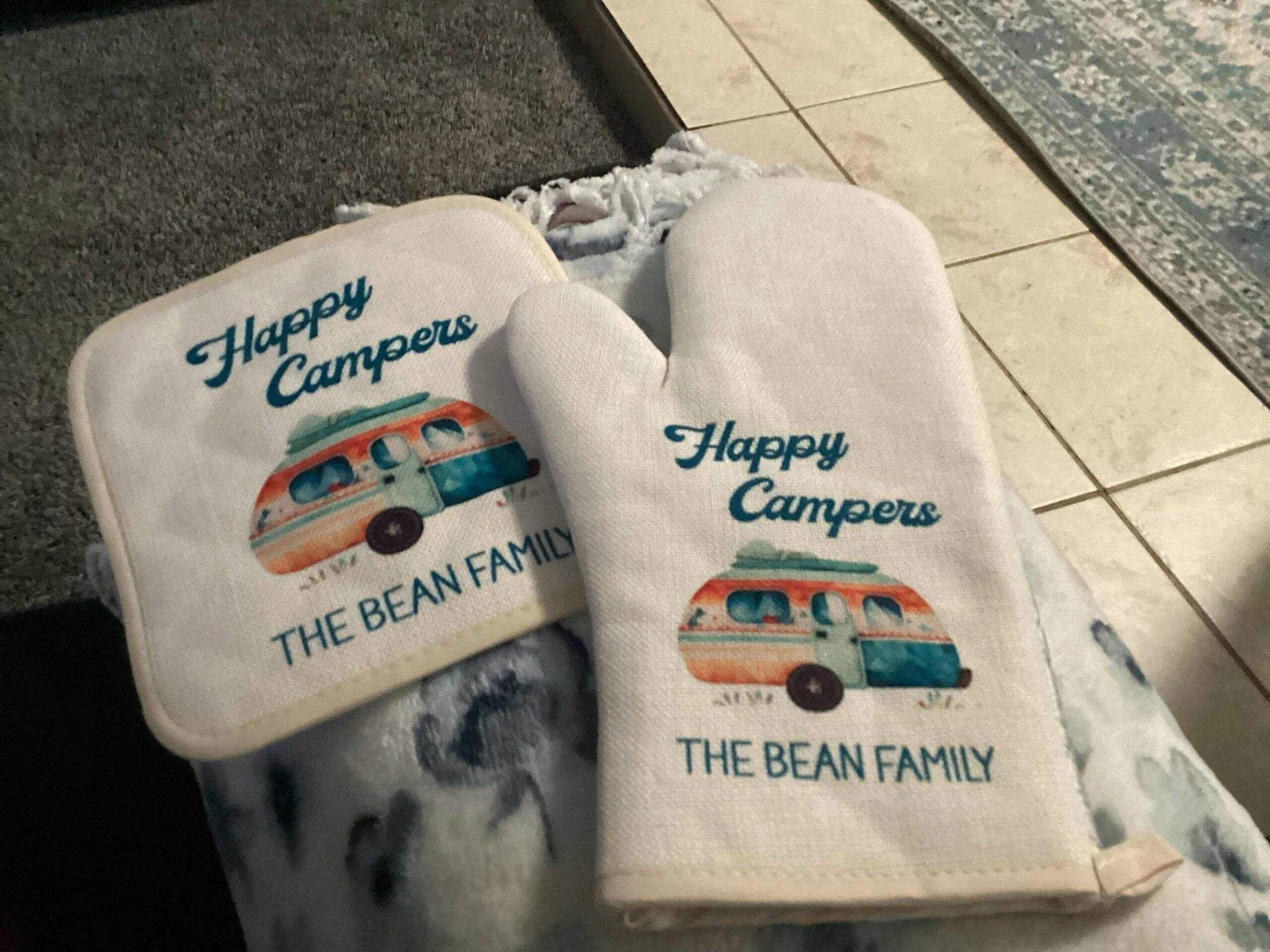Happy Camper Personalized Oven Mitt & Pot Holder Set, Camper Gift Set RV Oven Mitts, Gifts for Mom, Camping RV