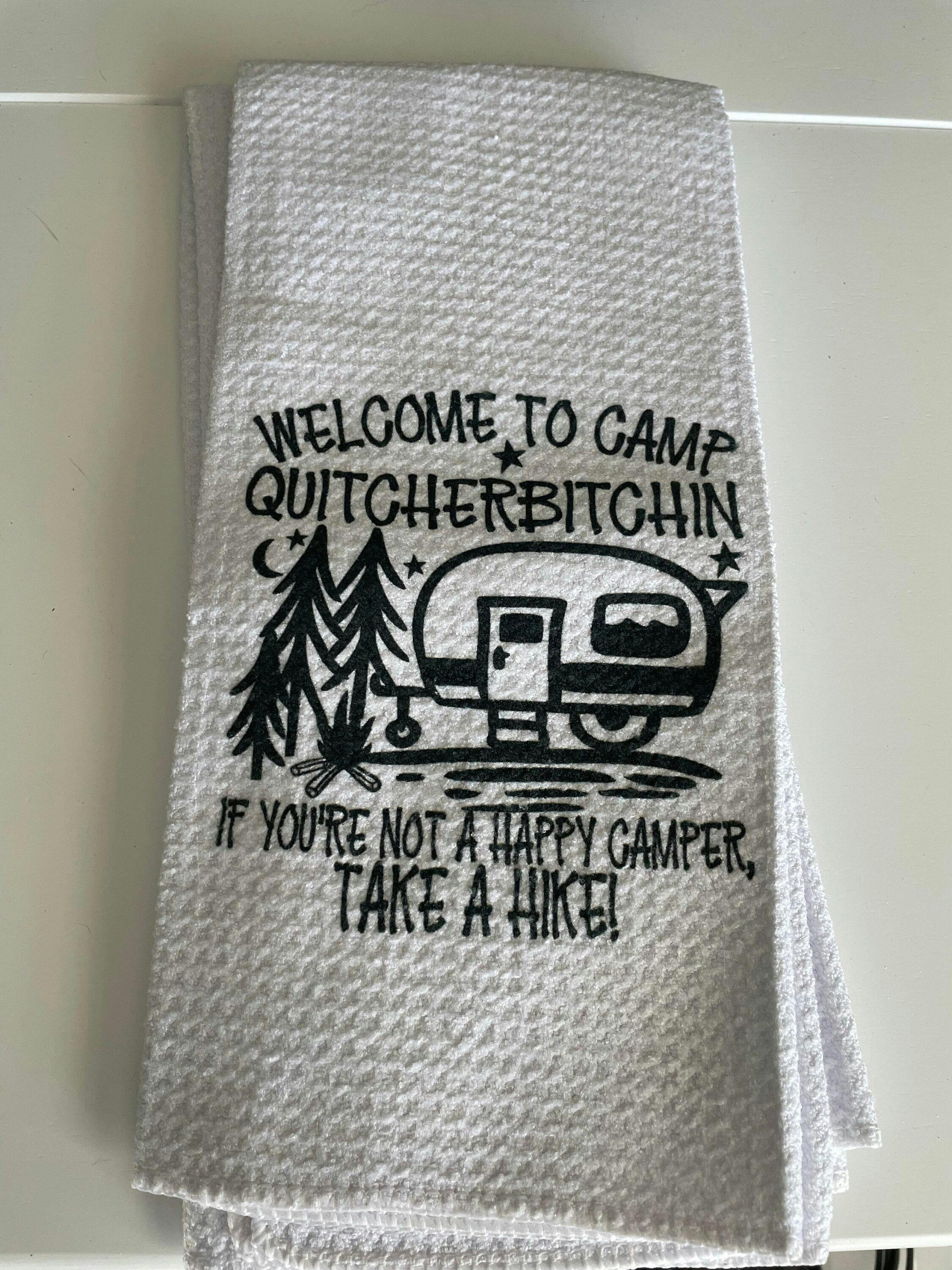 Welcome To Camp Quitcherbitchin Funny Dish Towel - Tea Towel Camper Kitchen Decor - Camping RV Travel Trailer Kitchen Towel